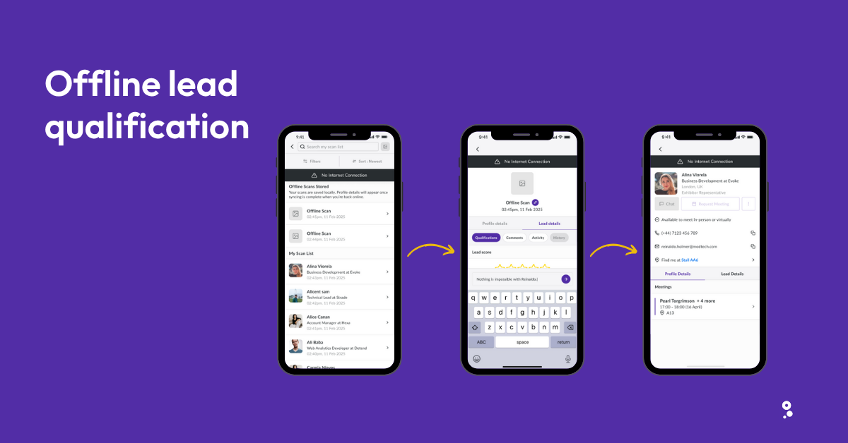 Now, when Wi-Fi drops, your exhibitors can keep working - scoring leads, adding comments, adding a placeholder name through simplified offline versions of the profile and lead detail screens. Every interaction stays saved and syncs automatically once the connection is restored.